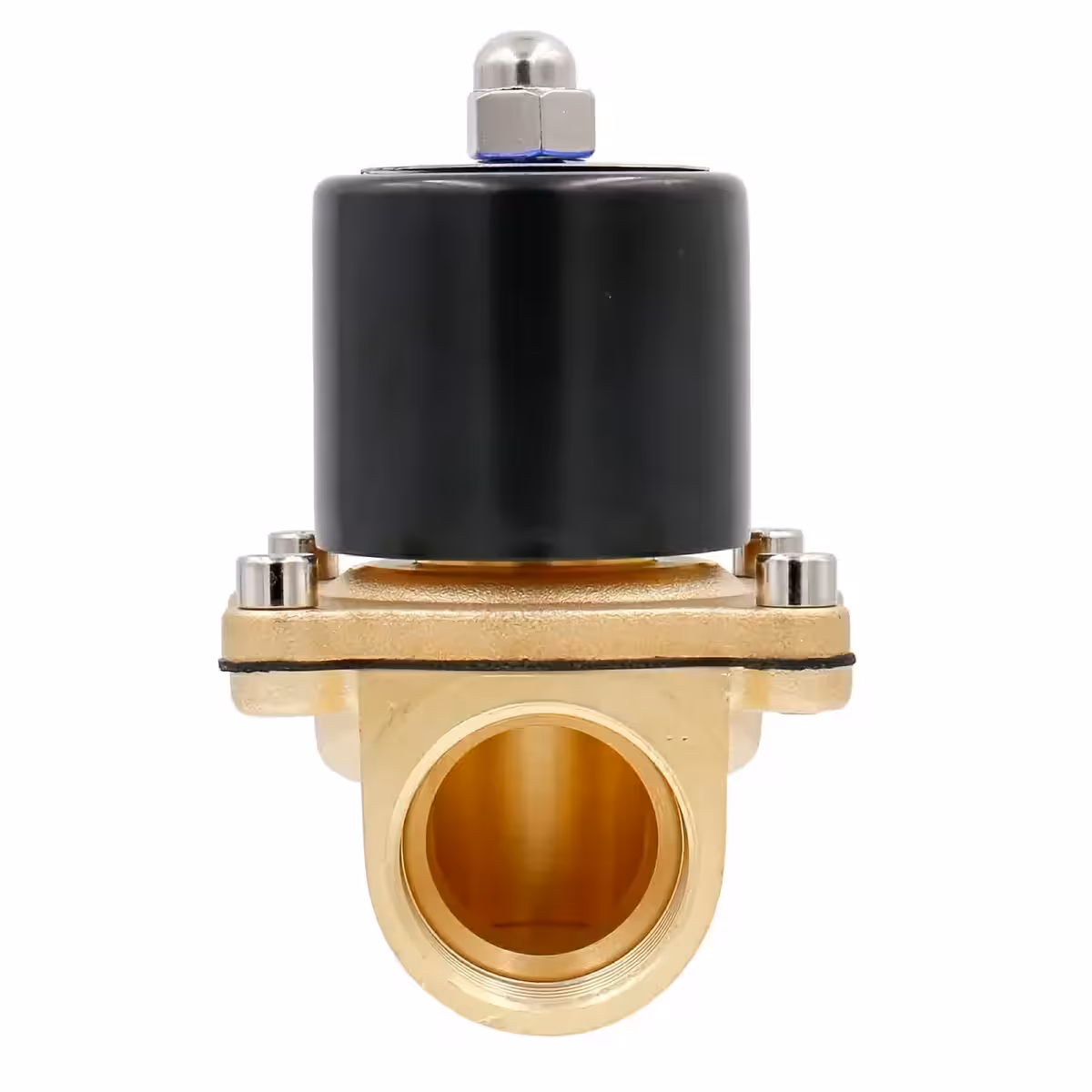 Ten elektrozawór elektromagnetyczny kontroluje przepływ cieczy za pomocą elementu ruchomego (tłoka lub dysku), napędzanego przez cewkę elektromagnetyczną. Po podaniu prądu cewka generuje pole magnetyczne, które przesuwa element ruchomy, umożliwiając przepływ cieczy. Po odłączeniu zasilania tłok wraca do pozycji początkowej, blokując przepływ.