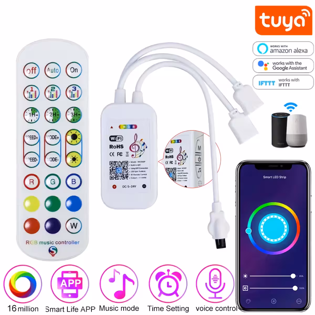 Kontroler Taśmy LED RGB Smart WiFi Tuya z Pilotem, Ściemniaczem i Sterowaniem Muzycznym