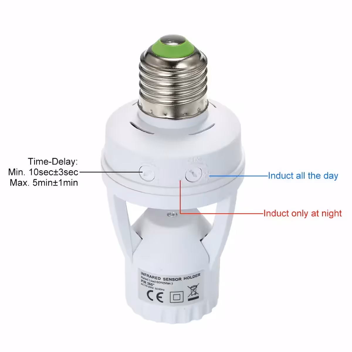 Ten czujnik PIR do oprawki E27 montuje się bardzo łatwo, zastępując standardową oprawkę żarówki. Pasuje do wszystkich typów żarówek z gwintem E27: tradycyjnych, energooszczędnych lub LED. Czułość oraz poziom światła, przy którym czujnik włącza się, są regulowane, co zapewnia dużą elastyczność w użyciu zarówno w ciągu dnia, jak i w nocy.