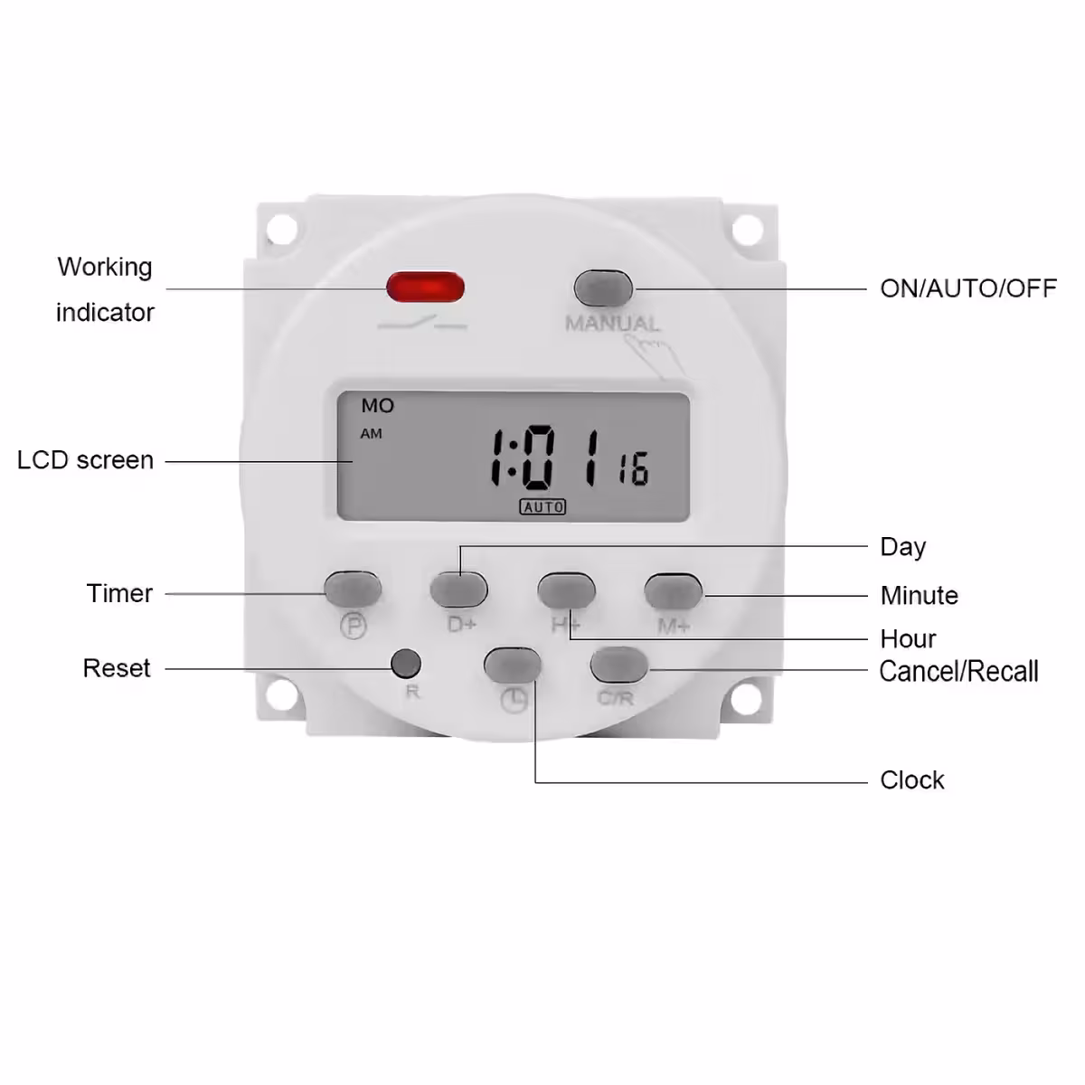 Cyfrowy timer został zbudowany w nowoczesnej technologii CMOS, z wykorzystaniem mikrokontrolera z wysokiej niezawodności kwarcem. Umożliwia precyzyjne automatyczne czasowanie dla dowolnego urządzenia elektrycznego, z minimalnym cyklem 1 minuty oraz programowaniem dziennym lub tygodniowym.