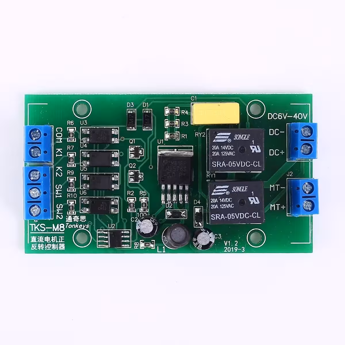Kompaktowy moduł do sterowania kierunkiem silników DC, idealny dla systemów z ogranicznikami krańcowymi, siłowników, mechanizmów liniowych lub projektów DIY, gdzie potrzebne są funkcje ruchu do przodu i do tyłu. Działa w bardzo szerokim zakresie napięć, od 4V do 40V, przy czym dla stabilnej pracy zaleca się 6V–36V. Silnik podłączony otrzymuje to samo napięcie co moduł.