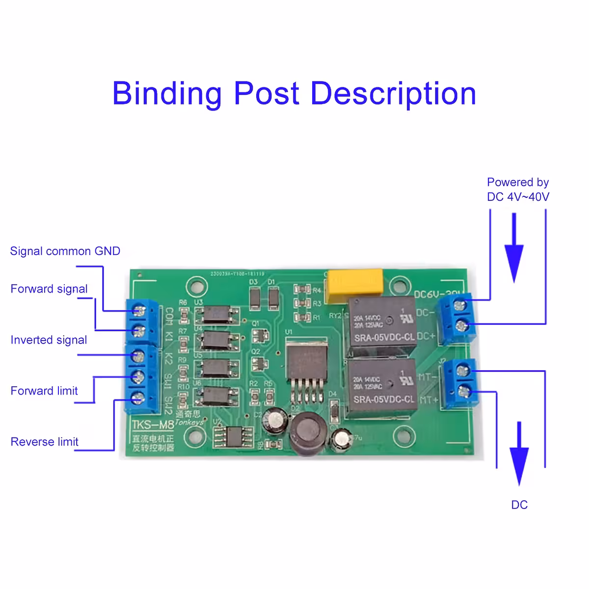 Kontroler kierunku silnika – DC 4–40V, do 20A, tryby PO/P1 z ogranicznikami